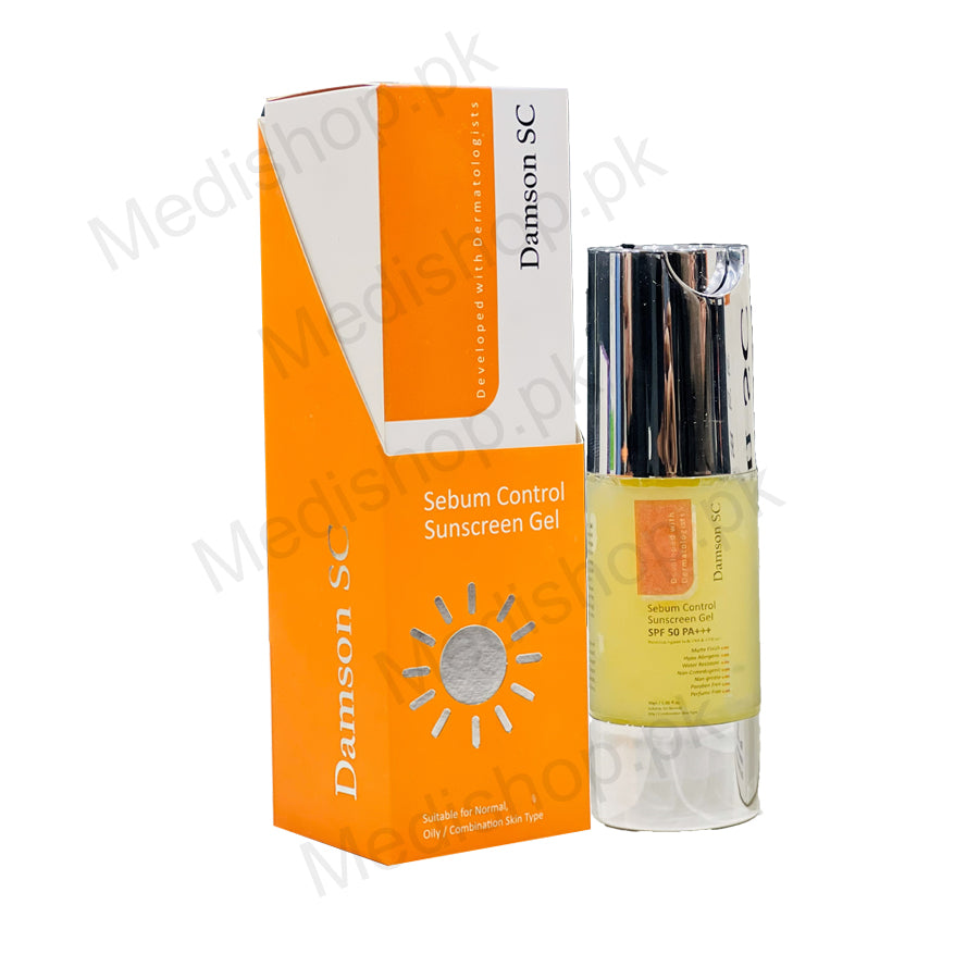 Damson SC Sebum Control Sunscreen Gel SPF 50 contains unique sebomicropore structures which reduce sebum. It also helps protect against Skin darkening, pigmentation and premature Skin ageing. It's non-greasy Gel based formulation is specially designed for Oily and Combination Skin. Sebum control formula with unique sebomicropore structures. Helps against the Sun's harmful UVA (ageing) and UVB (burning) rays with SPF 50 and PA+++ Excellent skin compliance Suitable for sensitive skin